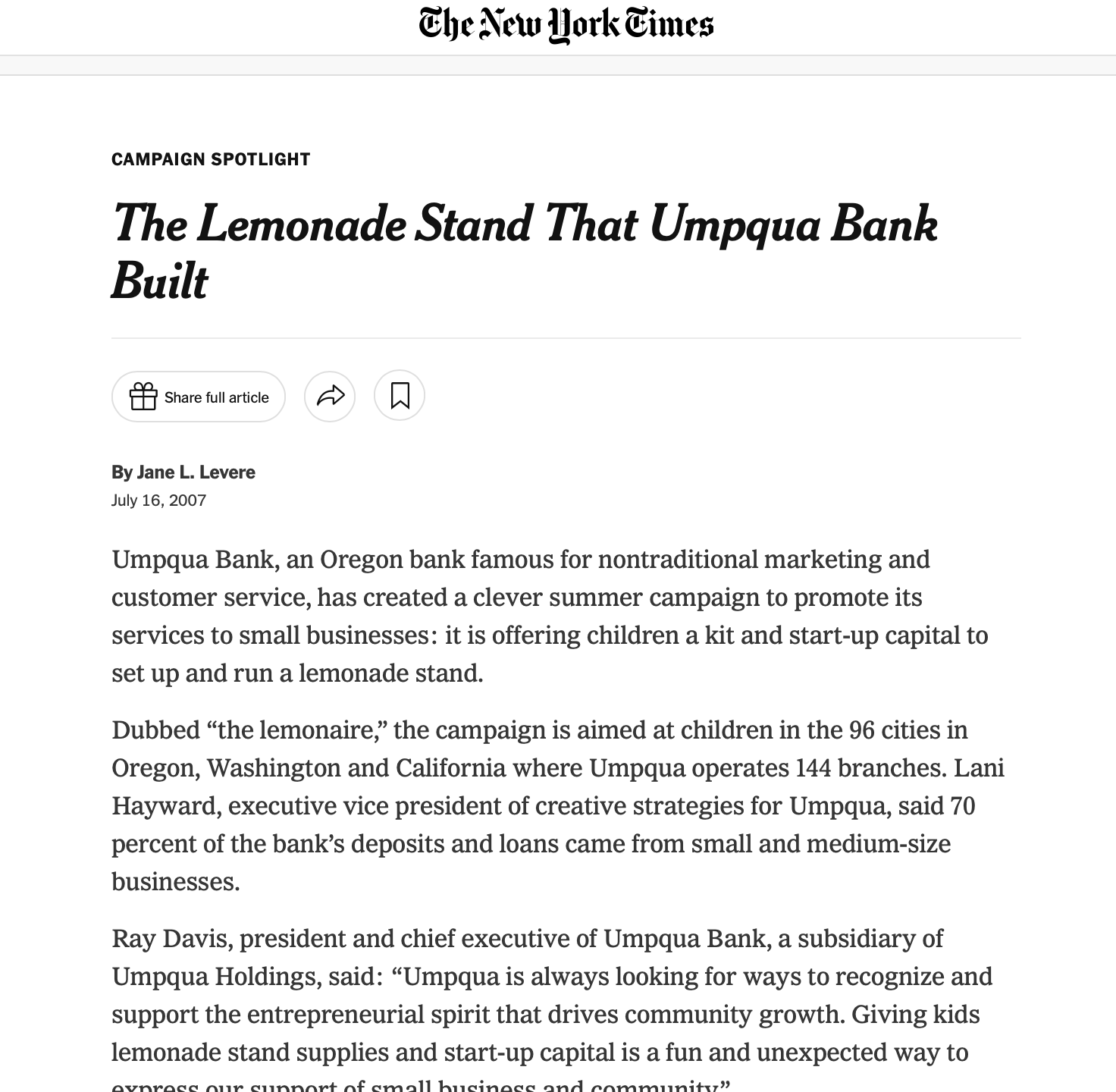 We helped Umpqua reach small businesses by demonstrating how we can help the smallest of small businesses: the lemonade stand. The campaign which included running ads written in crayon promoted Umpqua’s special program to help kids start and promote their own lemonade stands. Those interested got start up kits including $10 in capital. While the lemonade stand is a good metaphor for small business banking, it turned out to be a great way for Umpqua to build new relationships in the community by helping kids, (some of whom whose parents were small business owners) start their first business. This campaign became a big part of Umpqua Bank’s reputation for non-traditional marketing. To this day it shows up in a few books on the subject of experiential marketing and is admired among marketers in the banking industry. The campaign blew away their goals and expectations by bringing in new customers and deposits for small businesses.